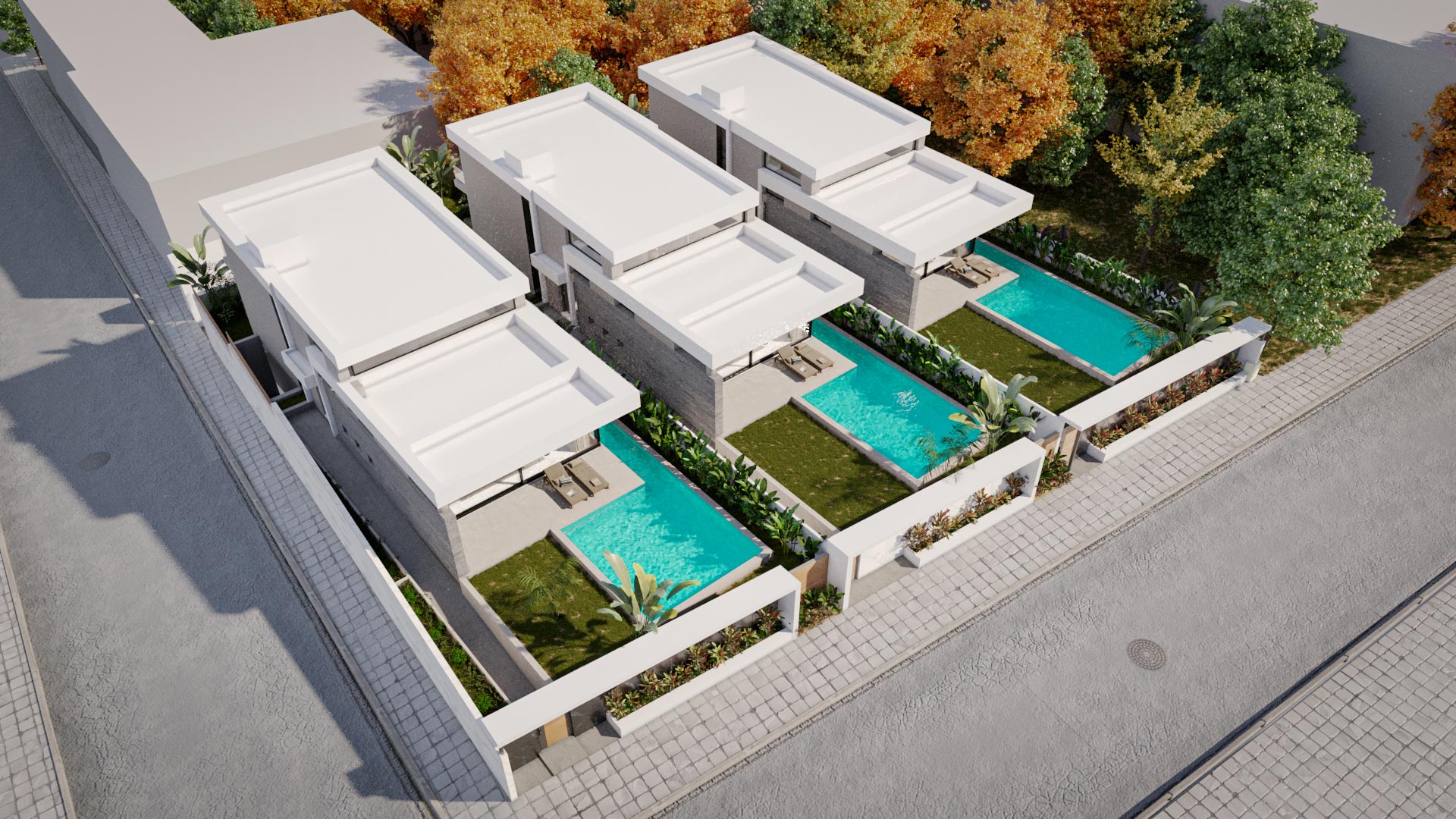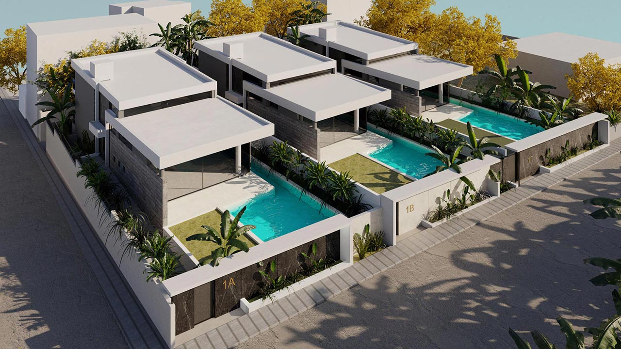 Three luxurious three-storey maisonettes, each with each own swimming pool, two basements, attic and three parking areas.